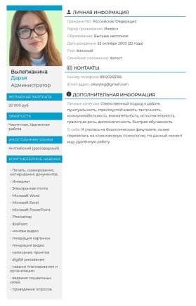 Образование: высшее Знание языков: Гражданство: РФ Возраст: 32года Пол: ж О себе: активная, коммуникабельная, ставлю цель и добиваюсь, в поисках подрабо...