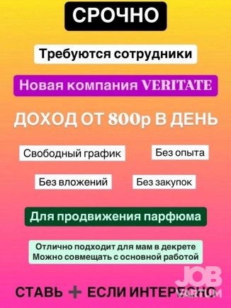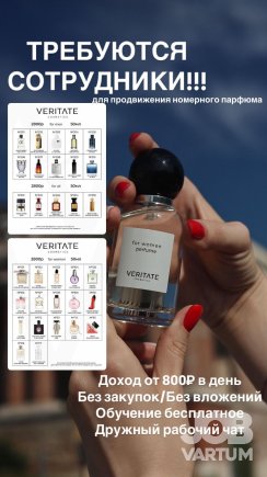 Желание работать и зарабатывать Компания: VERITATE Приглашаю к сотрудничеству девушек Для продажи и продвижения парфюма. *Подходит абсолютно всем: моло...