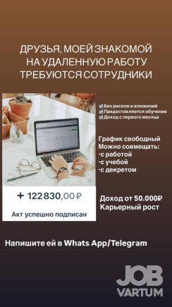 Приветствую,ищу людей на удалённую работу, без вложений, всему обучим и научим, как нужно. Работа от 2 часов в день, ты сам выбираешь когда и сколько работать.