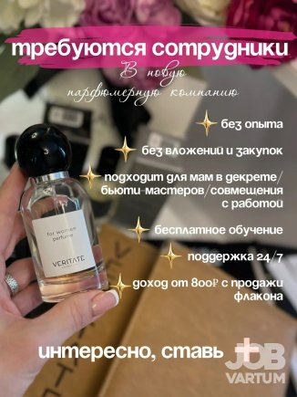 Требуется сотрудник в новую компанию номерных духов VERITATE, произведённых в Турции. Это эквиваленты известных брендов, с более чем 20% аромаэссенции, стойкие и шлейфовые.