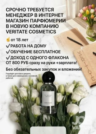 Работа с парфюмом, консультирование Компания: Veritate Любой город Всем привееет Ищу активных девушек для работы с элитным парфюмом из Турции! Рабо...