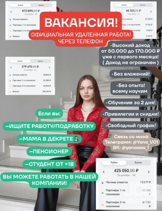 Условия: Без рисков и вложений. От вас требуется легкость в обучении, коммуникабельность, умение общаться и любовь к людям, а также стрессоустойчивость. Готовность и стремление к карьерному и личностному развитию. Для работы достаточно телефона.